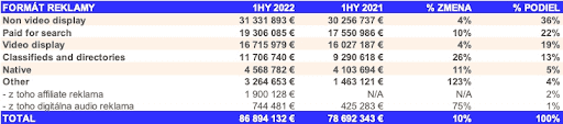 Na Slovensku sa v prvom polroku 2022 preinvestovalo do internetovej reklamy 87 miliónov Eur. V medziročnom porovnaní s prvým polrokom 2021 výdavky do online reklamy zaznamenali 10% rast. Po prvýkrát sa nachádza v reporte aj affiliate marketing s 2% podielom na celkových výdavkoch.