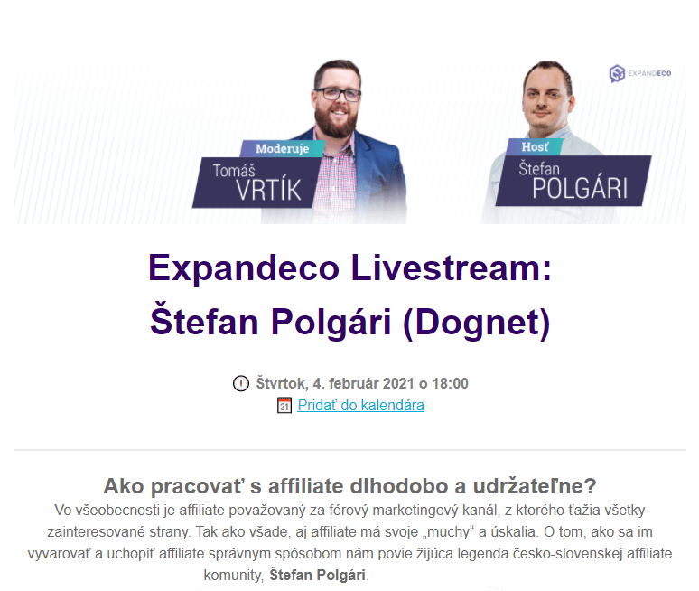 Live stream v Expandeco bol na tému “Ako pracovať s affiliate dlhodobo a udržateľne?” Ale téma bola nakoniec úplne iná. 🙂 V rozhovore sa dozviete všetko možné, aj o ceste Dognetu tam, kde je dnes aj niečo o samotnom Štefanovi. Aj sa zasmejete, aj sa určite dozviete niečo nové z pozadia Vašej affiliate siete. Záznam streamu si môžete pozrieť tu.