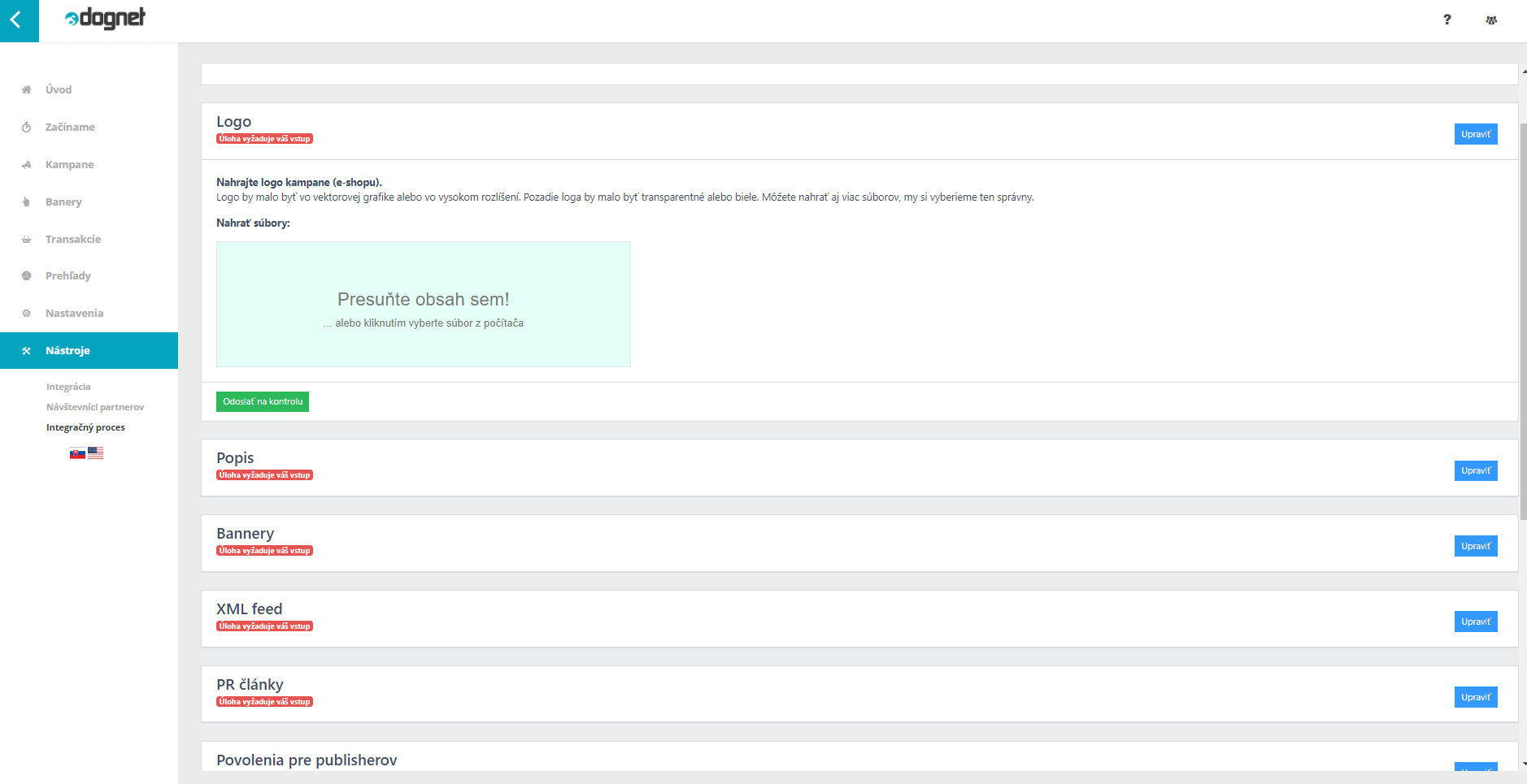 Nový integračný proces pri spúšťaní kampaní, sme zaviedli našim inzerentom priamo do administrácie, aby sme tak vylepšili prehľadnosť a rýchlosť pri nahrávaní jednotlivých propagačných materiálov, ktoré sú nevyhnutné pre spustenie kampane. Priamo do administrácie tak môžete nahrávať požadované propagačné materiály a stiahnete si odtiaľ aj trackovacie kódy, ktoré je potrebné nasadiť na Vašu stránku.