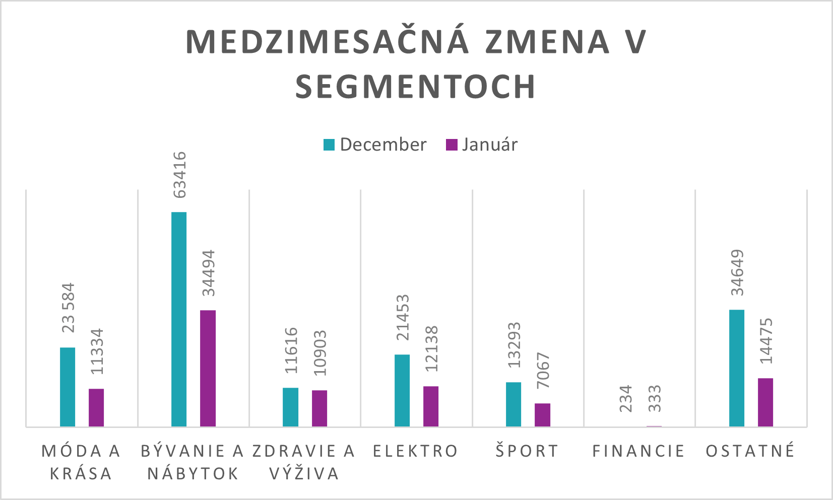 Silnejšie zastúpenie oproti decembru má v oboch parametroch aj segment Zdravie a výživa. Segment elektro a šport sa oproti decembru vôbec nezmenil a segmenty Ostatné a Móda a krása si jemne pohoršili.