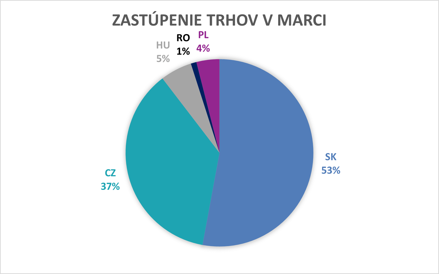 V marci sa oproti februáru zmenšil rozdiel slovenského a českého trhu, keď pomer českého stúpol z 32% na 37% a pomer slovenského trhu klesol z 58% na 53%.