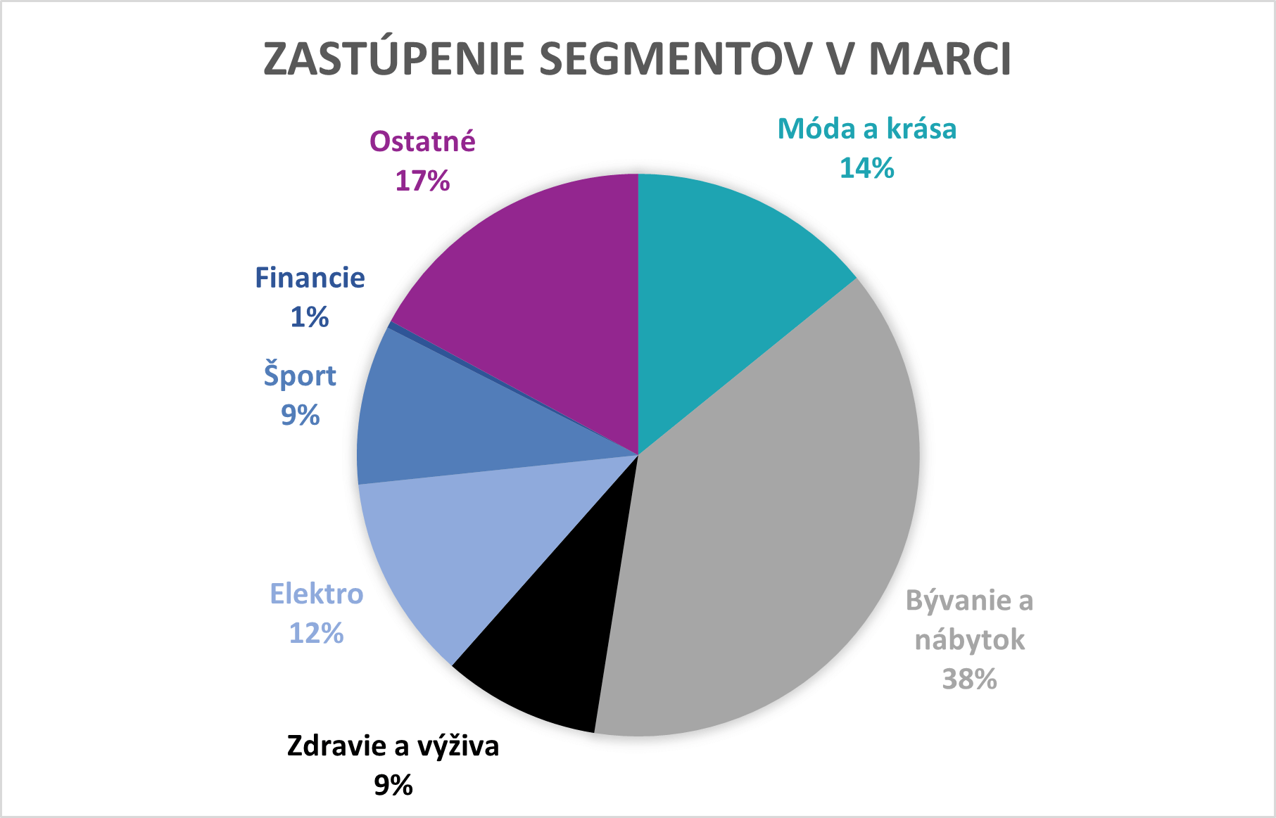 Výraznejší pokles nastal v pomere segmentu športu. Narástol naopak segment Bývanie a nábytok a mierne aj elektro, financie a zdravie a výživa.