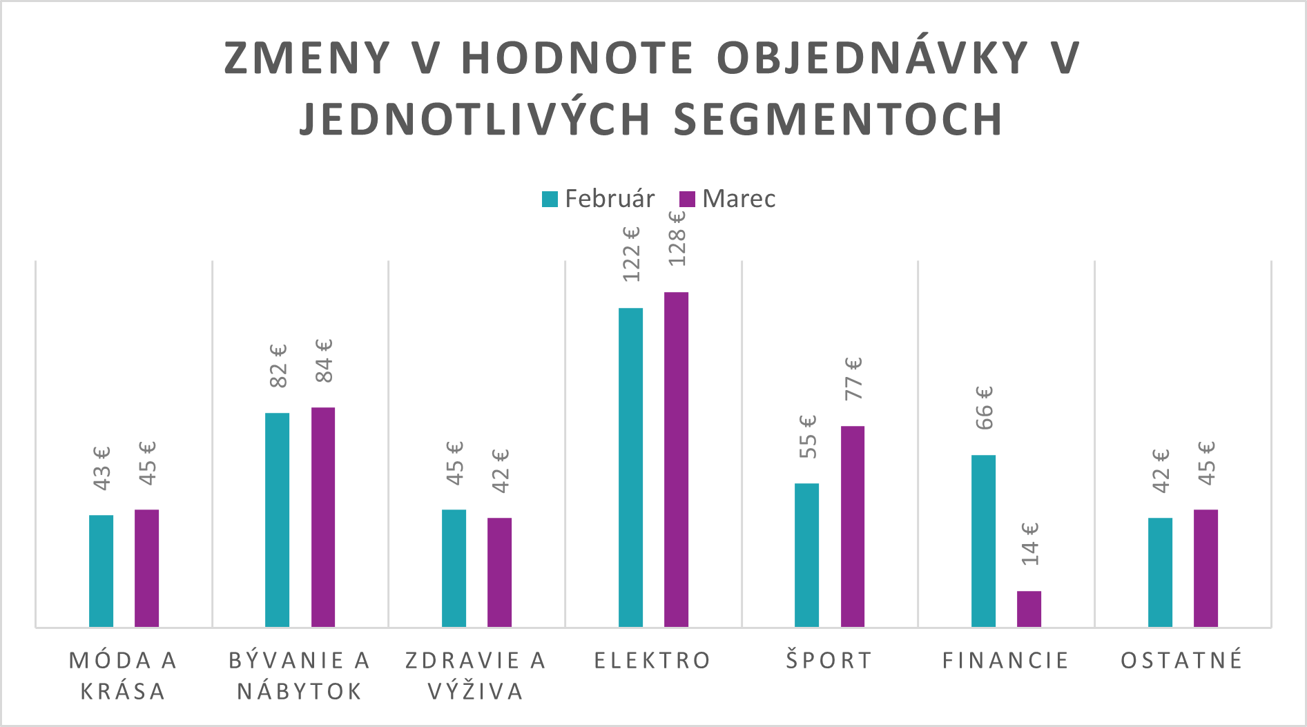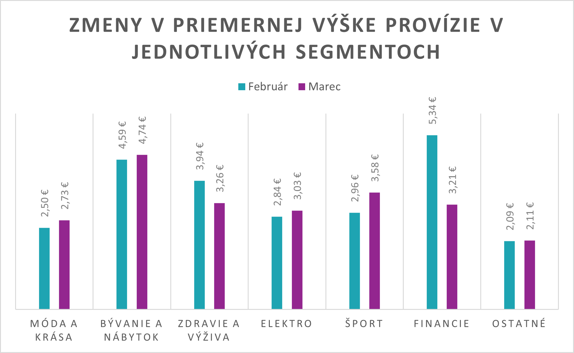 Vo väčšine segmentov priemerná hodnota objednávky aj priemerná provízia mierne narástla. Nižšia hodnota objednávky aj priemerná hodnota provízie bola akurát v segmente zdravie a výživa a financie.
