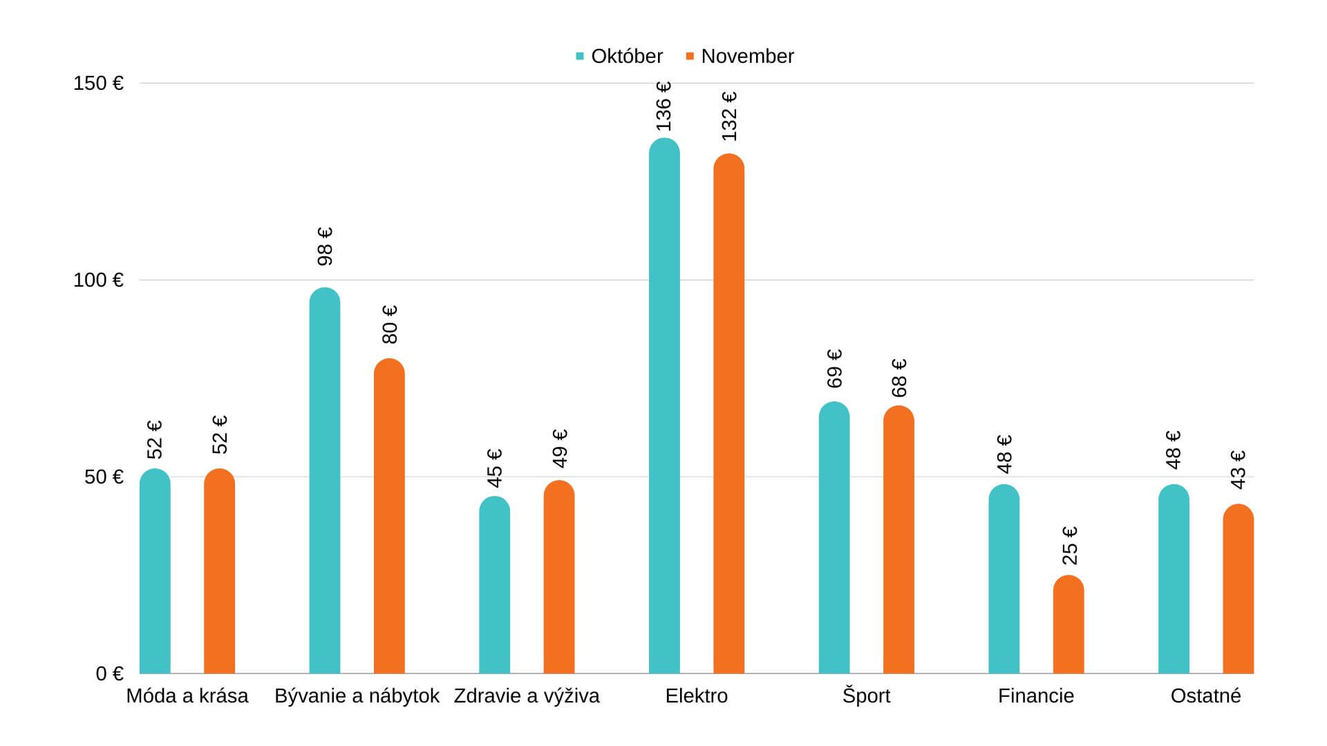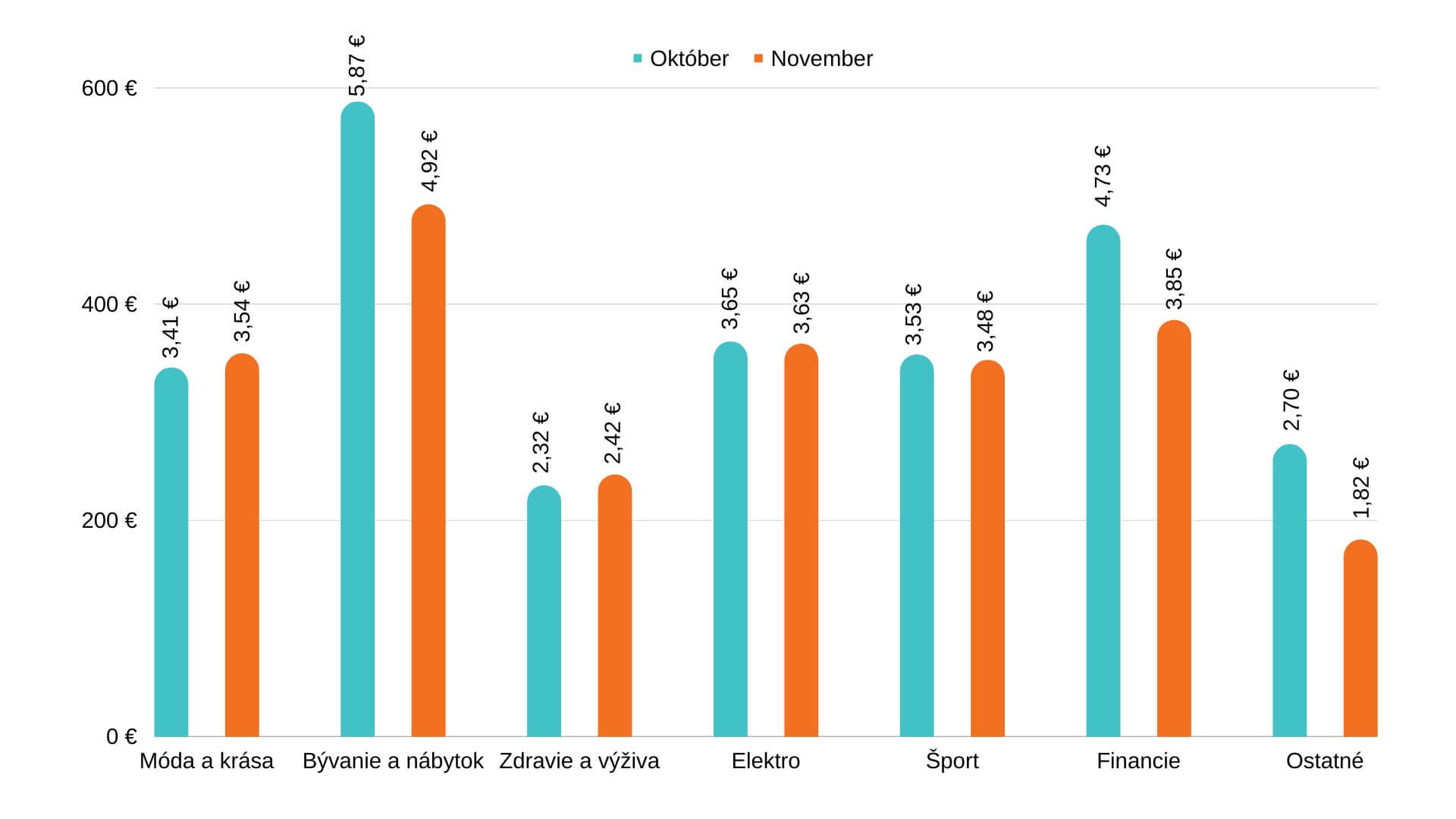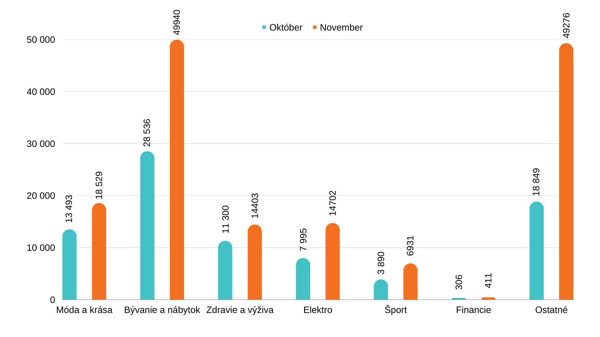 Pri porovnaní októbra a novembra došlo snáď k najdramatickejším medzimesačným zmenám. Vo všetkých segmentoch sledujeme nárast v počte konverzií. Absolútne najviac, o takmer 170 %, to bolo v segmente Ostatné.