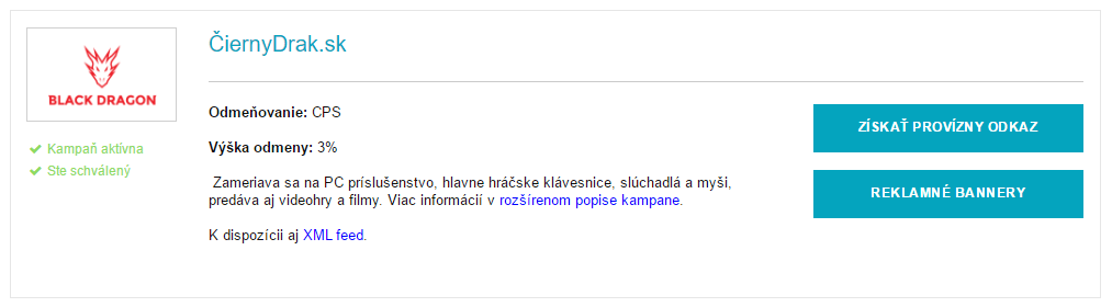 - Nájdite kampaň ČiernyDrak.sk a kliknite na „Získať provízny odkaz„