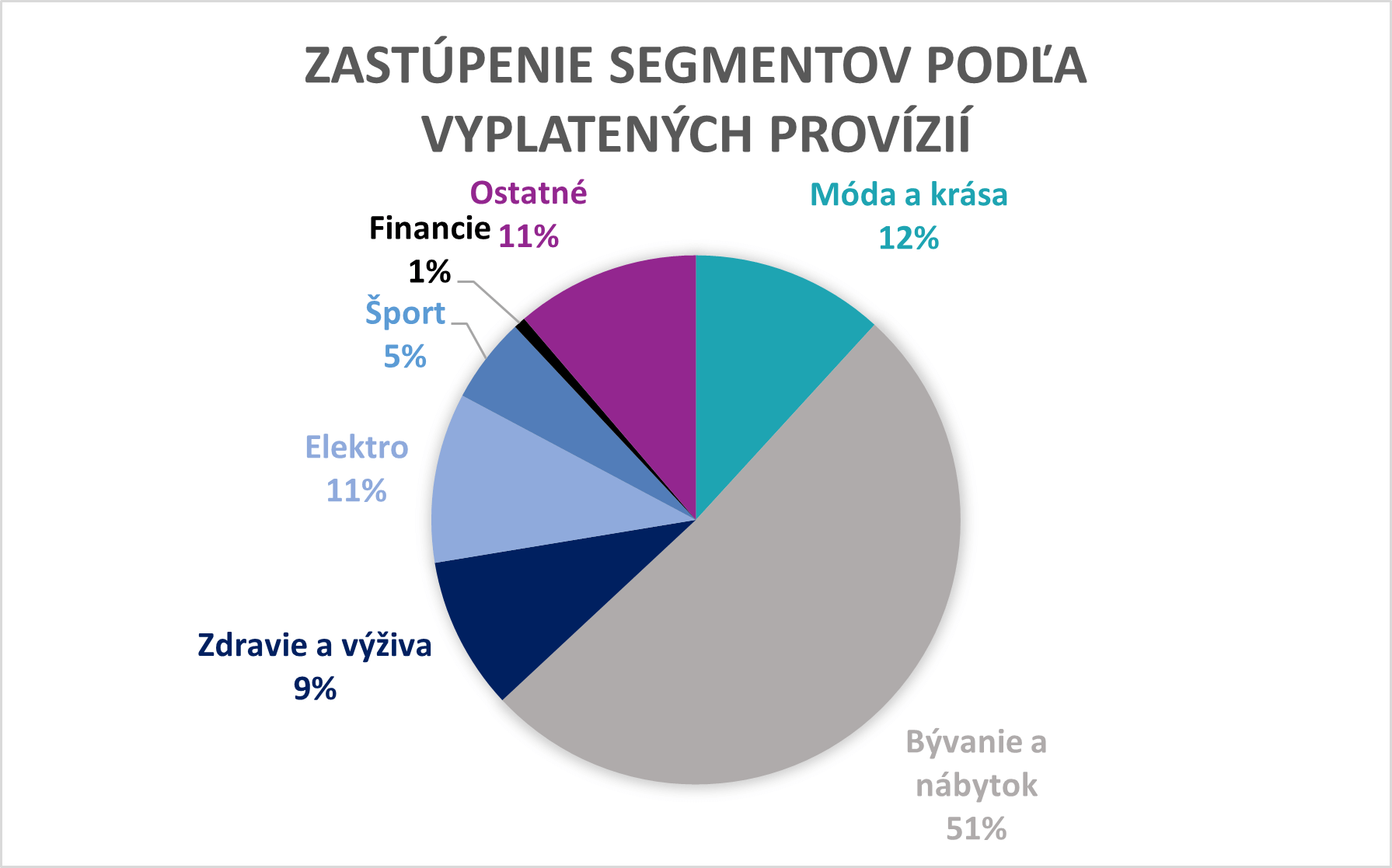 Tento mesiac ku klasickej štatistike zastúpenia segmentov podľa počtu konverzií pribudla aj rovnaká štatistika ale podľa vyplatených provízií. Tá potvrdzuje, že aktuálne je segment Bývanie a nábytok absolútne najsilnejším segmentom. Na počte konverzií sa podieľa “iba” 37%, no tvorí až polovicu z celkových vyplatených provízií v sieti.
