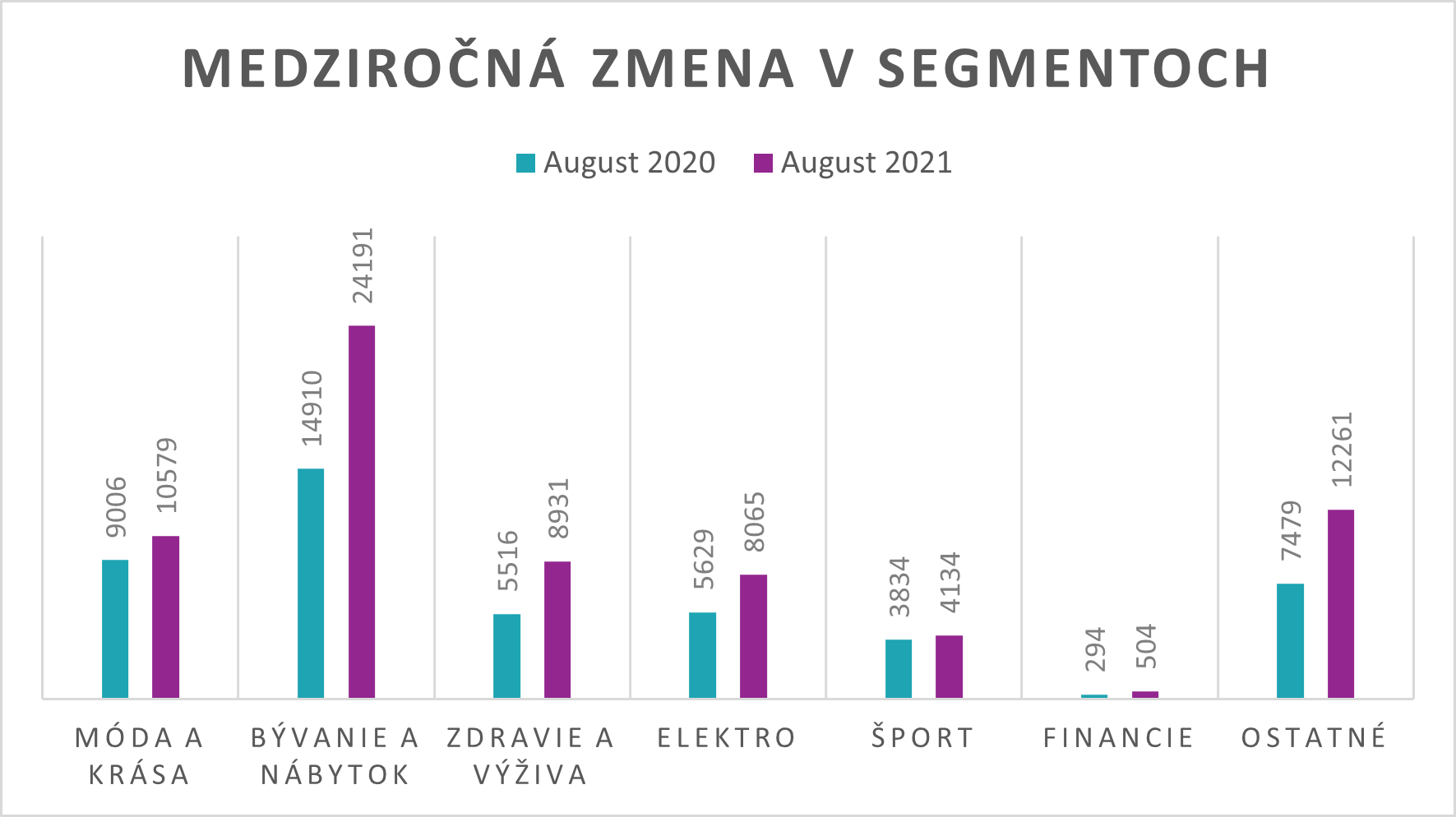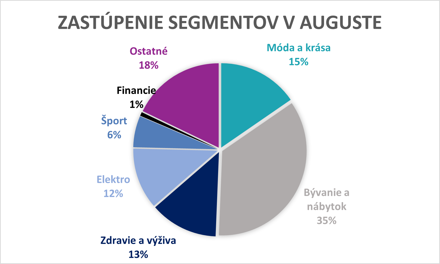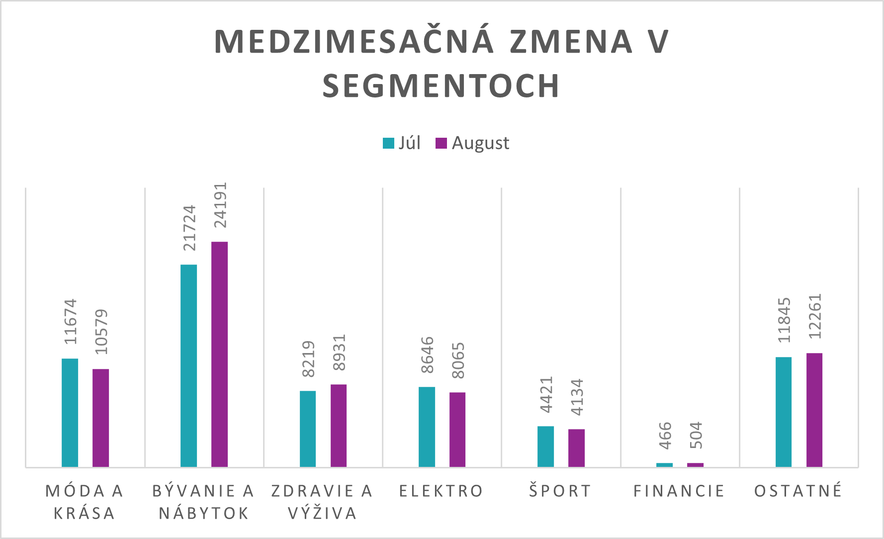 V porovnaní augusta s júlom môžeme vidieť pokles, ale i nárast. August bol našťastie silnejší v takmer všetkých segmentoch. Polepšili si segmenty Bývanie a nábytok, Zdravie a výživa, Financie a Ostatné. Naopak Móda, Elektro a Šport mierne poklesli.