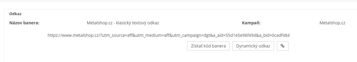 Pri každej kampani sa nachádza prvok „Klasický textový odkaz“. Potrebné ID čísla a UTM tagy získate z neho, prípadne z akéhokoľvek iného vygenerovaného kódu banneru z administrácie. „a_aid=“ je ID partnera a „a_bid=“ je kód banneru.