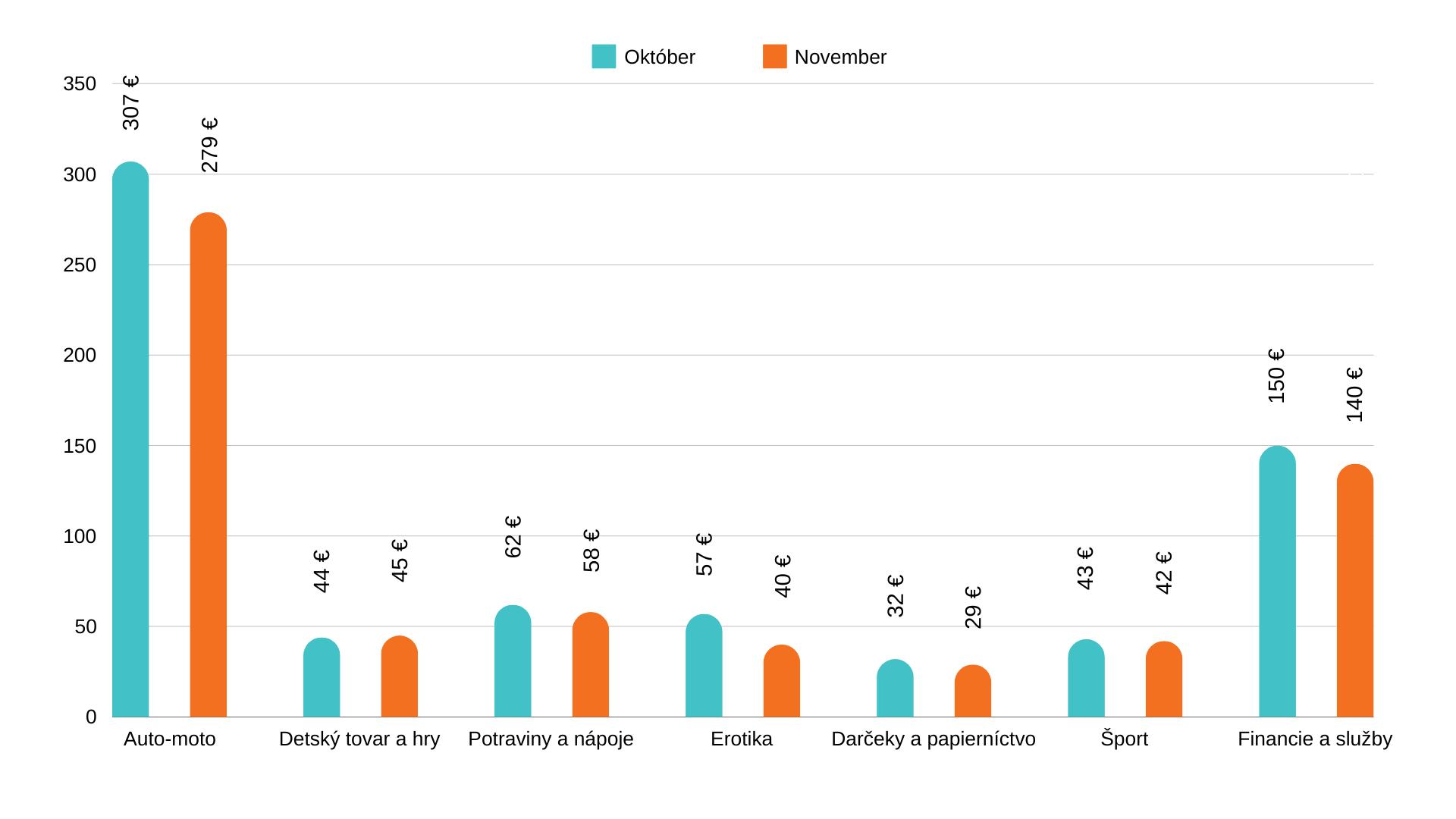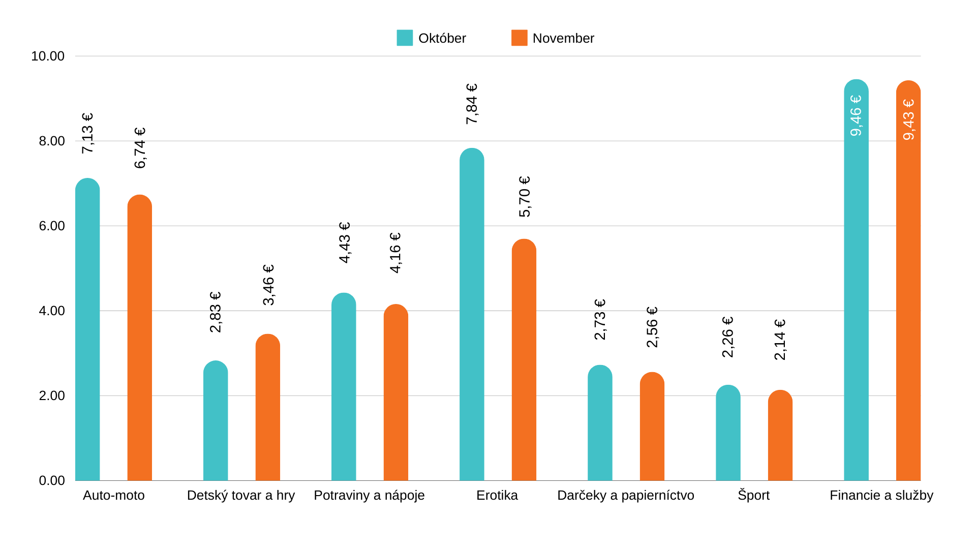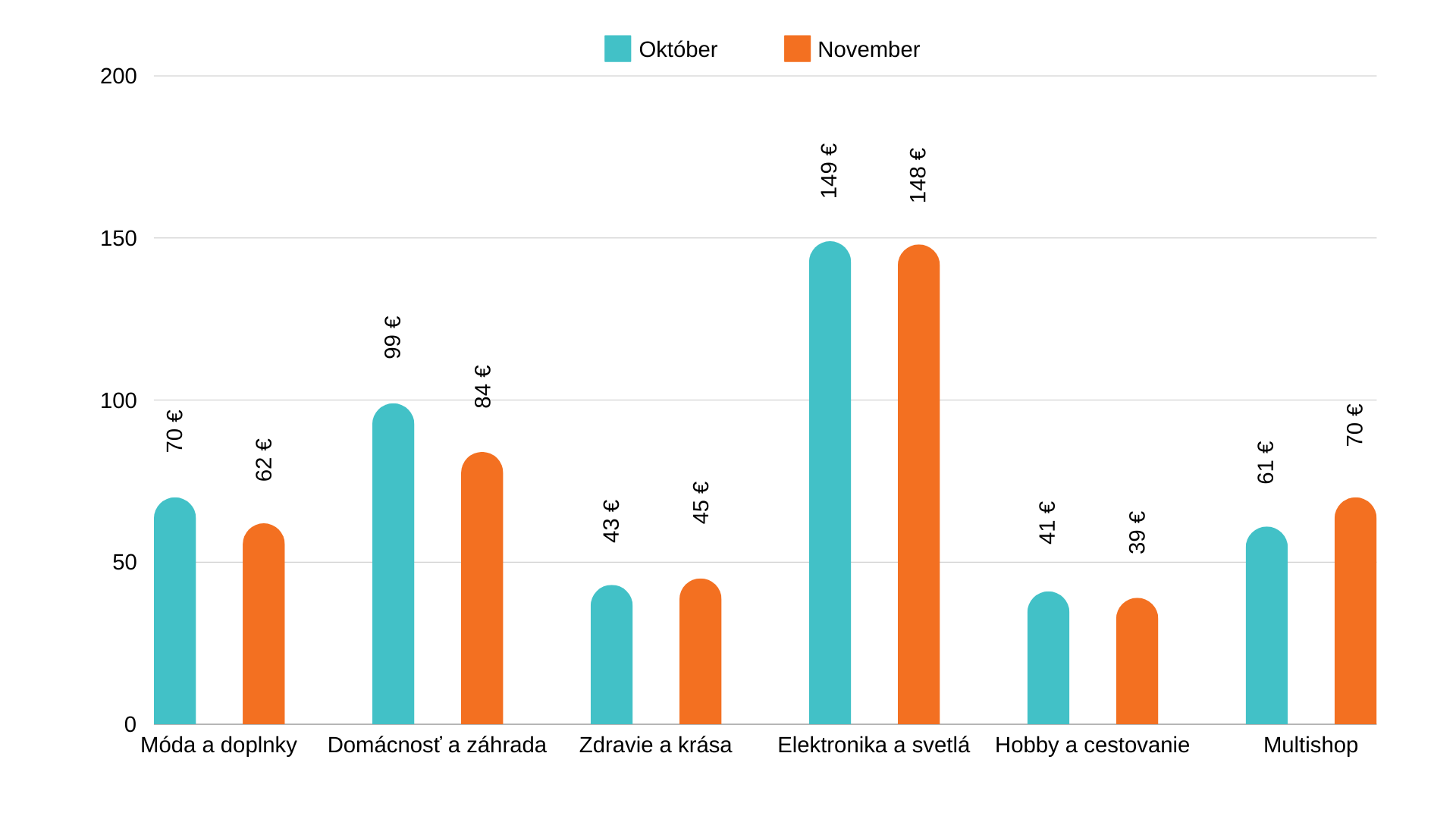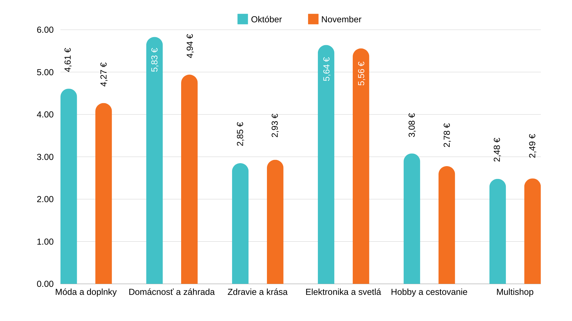 Ľudia síce v novembri nakupovali viac, no vďaka prebiehajúcim zľavám za menej. Takmer vo všetkých segmentoch pozorujeme poklesy v priemernej hodnote objednávky, s výnimkou segmentu Multishop (+15 %), Zdravie a krása (+3 %) a Detský tovar a hry (+2 %).