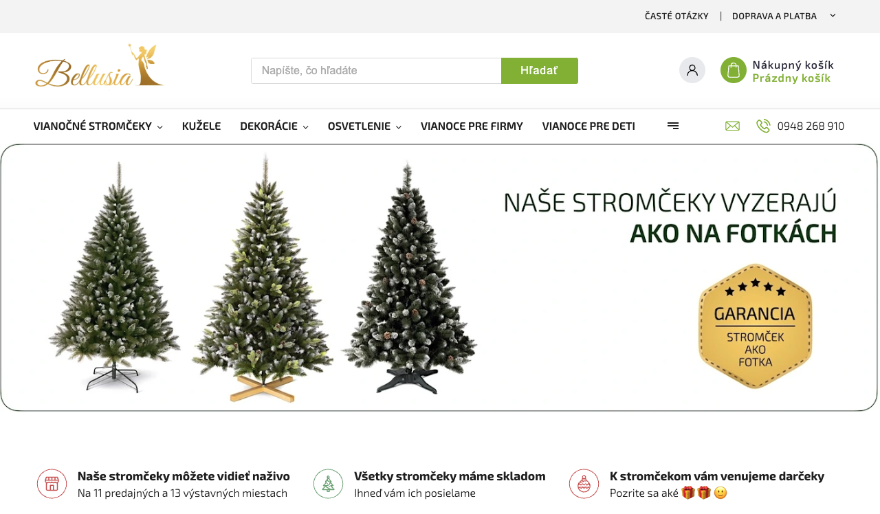 Práve tento sortiment nájdete v kampaniach Bellusia. Hlavnou kategóriou sú kvalitné umelé vianočné stromčeky, ale nájdete tu aj vianočné girlandy a vence, osvetlenie, ozdoby, škriatkov či anjelov.